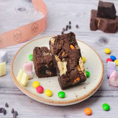 A premium gooey dar chocolate brownie topped with generous biscoff pas